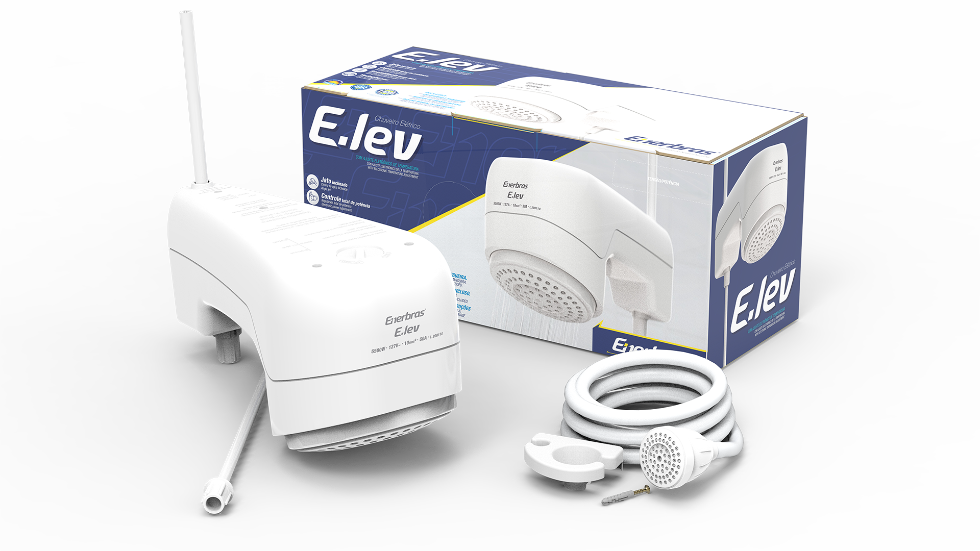 Uma ducha eletrônica com design moderno e diferenciado, conta acabamento de alto brilho, nas cores branco e preto. De dimensional compacto, conta com jato inclinado proporcionando um aumento na área de banho. Seu sistema de aquecimento permite variação total de potência de 0 a 100%, garantindo assim compatibilidade com sistemas de aquecimento solar. Conta com resistência em liga metálica de alto desempenho montada em suporte, facilitando sua manutenção. Eleve seu banho a uma nova categoria. Conheça a ducha E-lev.