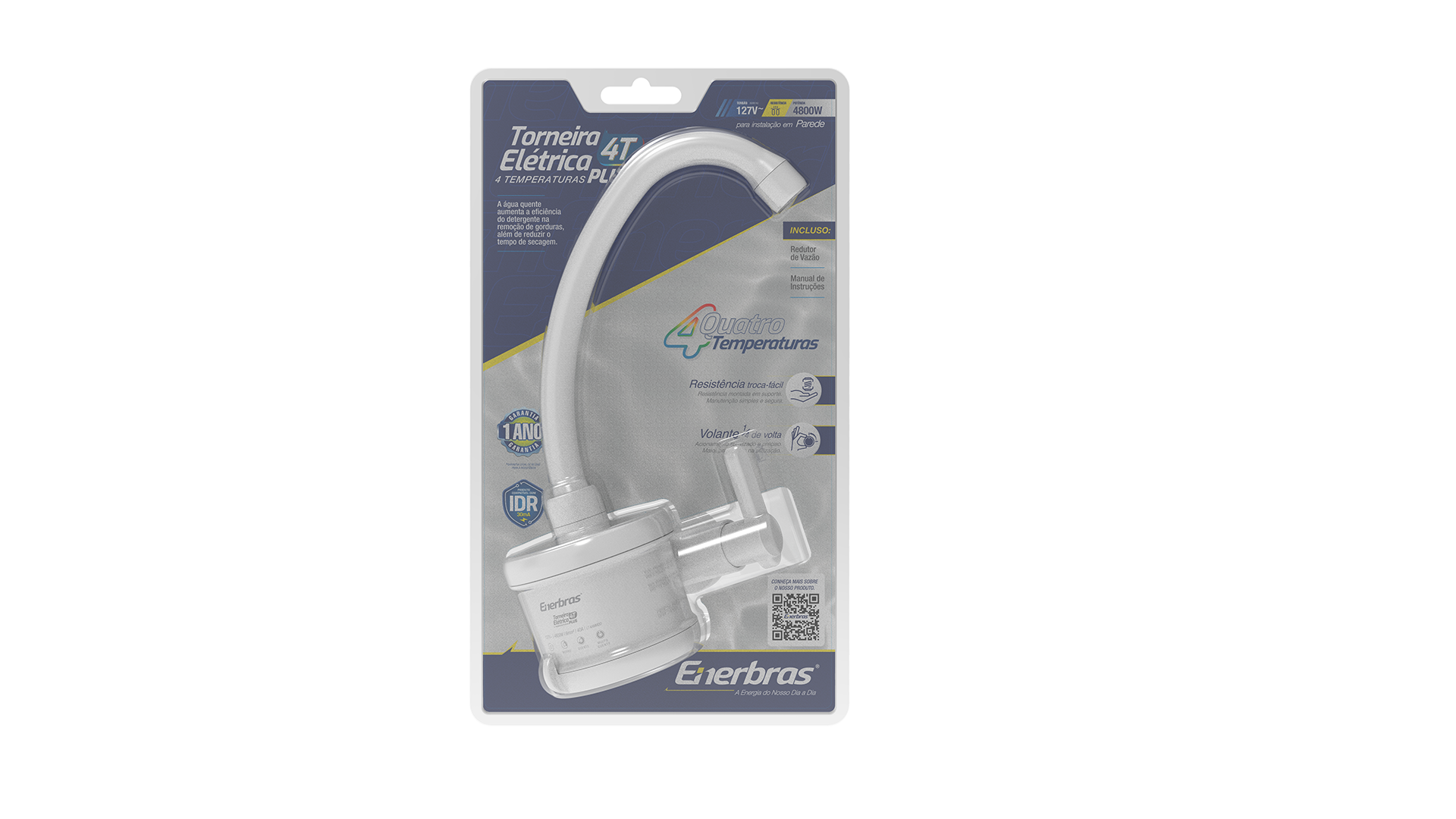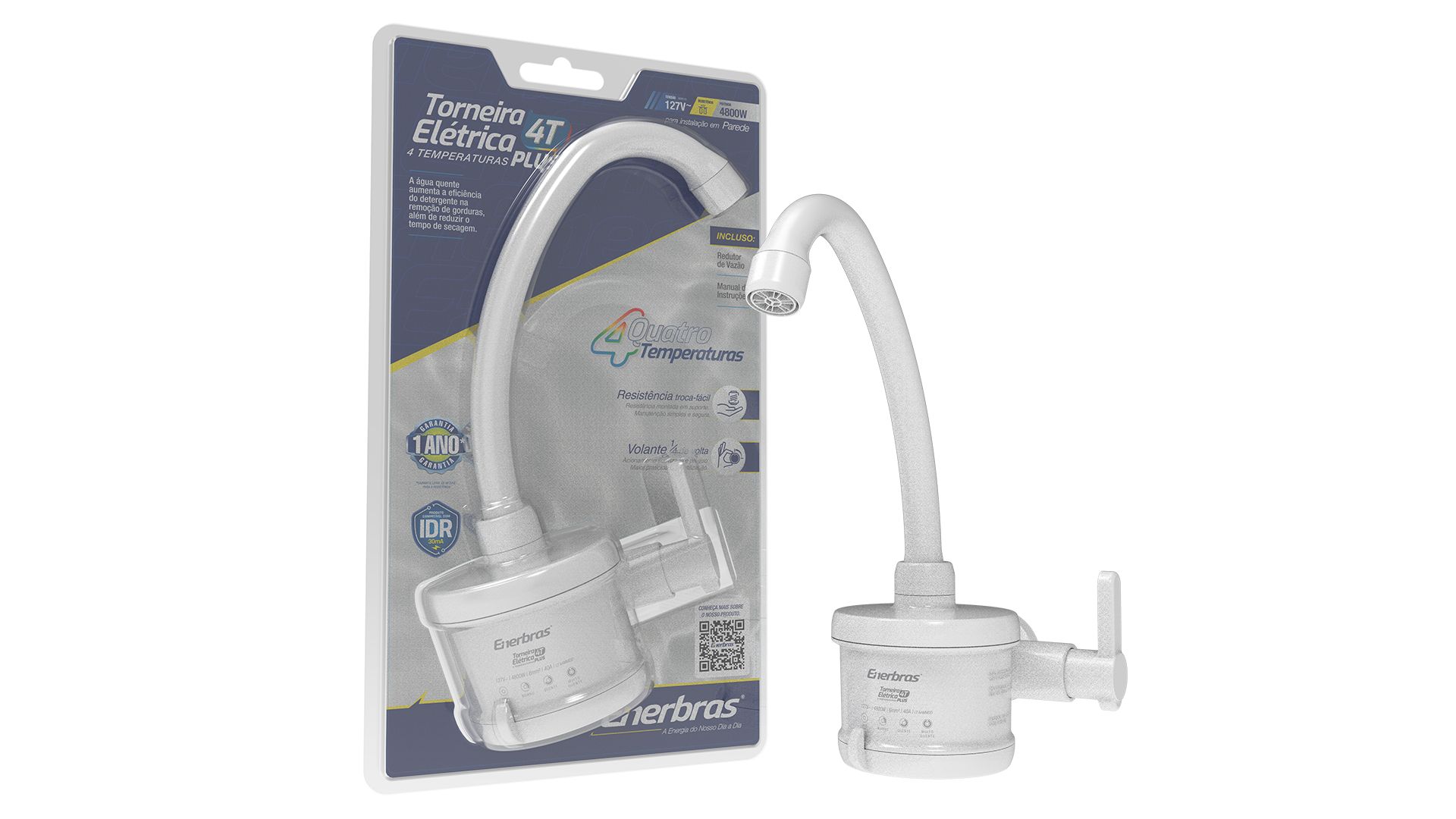 Linhas agradáveis combinadas com resistência, qualidade e funcionalidade definem a Torneira Elétrica Enerbras. Para maior facilidade de uso, conta com bica elevada e volante anatômico, além de possibilitar ajuste para quatro temperaturas